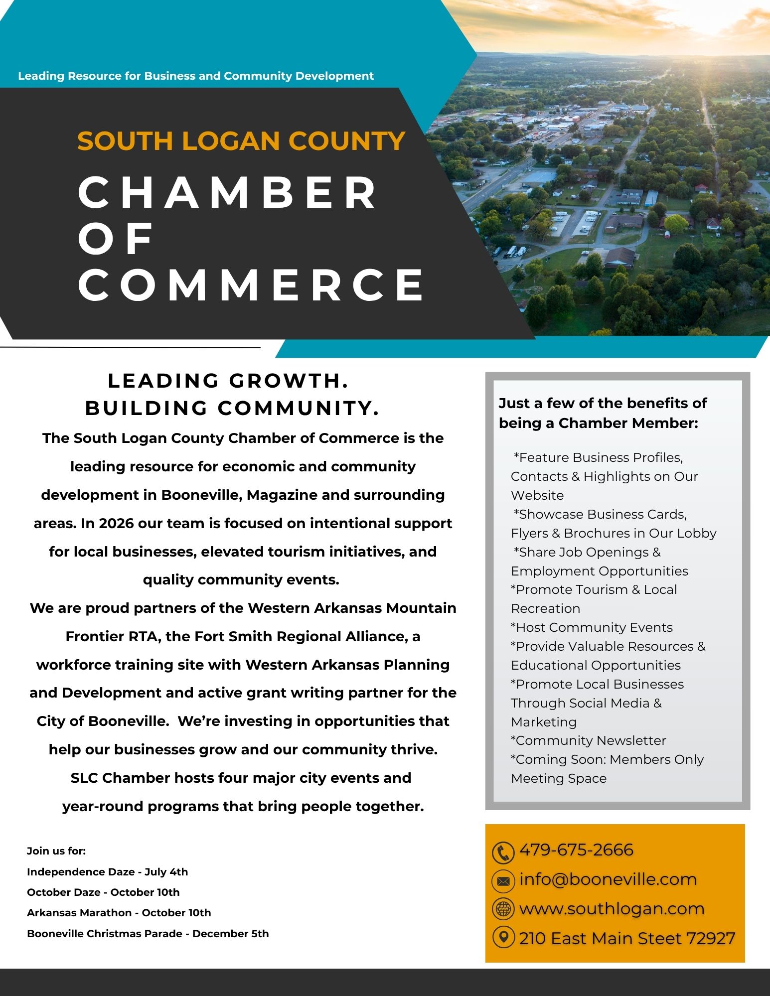 The South Logan County Chamber of Commerce is the leading resource for economic and community development in Booneville, Magazine, and surrounding areas. In 2026 out team is focused on intentional support for local businesses, elevated tourism initiatives, and quality community events.